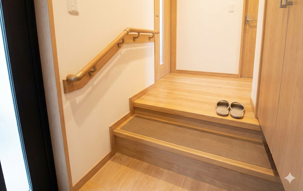 階段への手すり設置は、転倒防止と自立支援に大きな効果があります。足元が不安定でも、手すりを握ると昇降動作が格段に安定するからです。